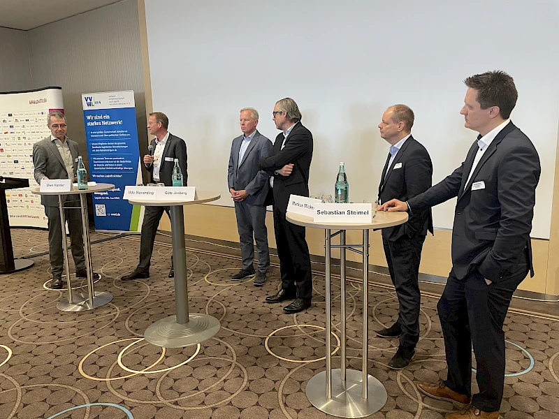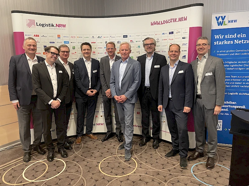 (v.r.n.l.): Michael Cordes, DVZ, Markus Micken, DB Cargo, Götz Jesberg, Rheincargo, Udo Sieverding, Ministerium für Umwelt, Naturschutz und Verkehr NRW, Uwe Harder, Verkehrsbetriebe Peine-Salzgitter, Sebastian Steimel, Deutsche Edelstahlwerke, Stefan Windgätter, Windgätter & Sohn / VVWL, Tobias Aldenhoff, Wirtschaftsvereinigung Stahl, Dr. Christoph Kösters, Kompetenznetz Logistik.NRW)